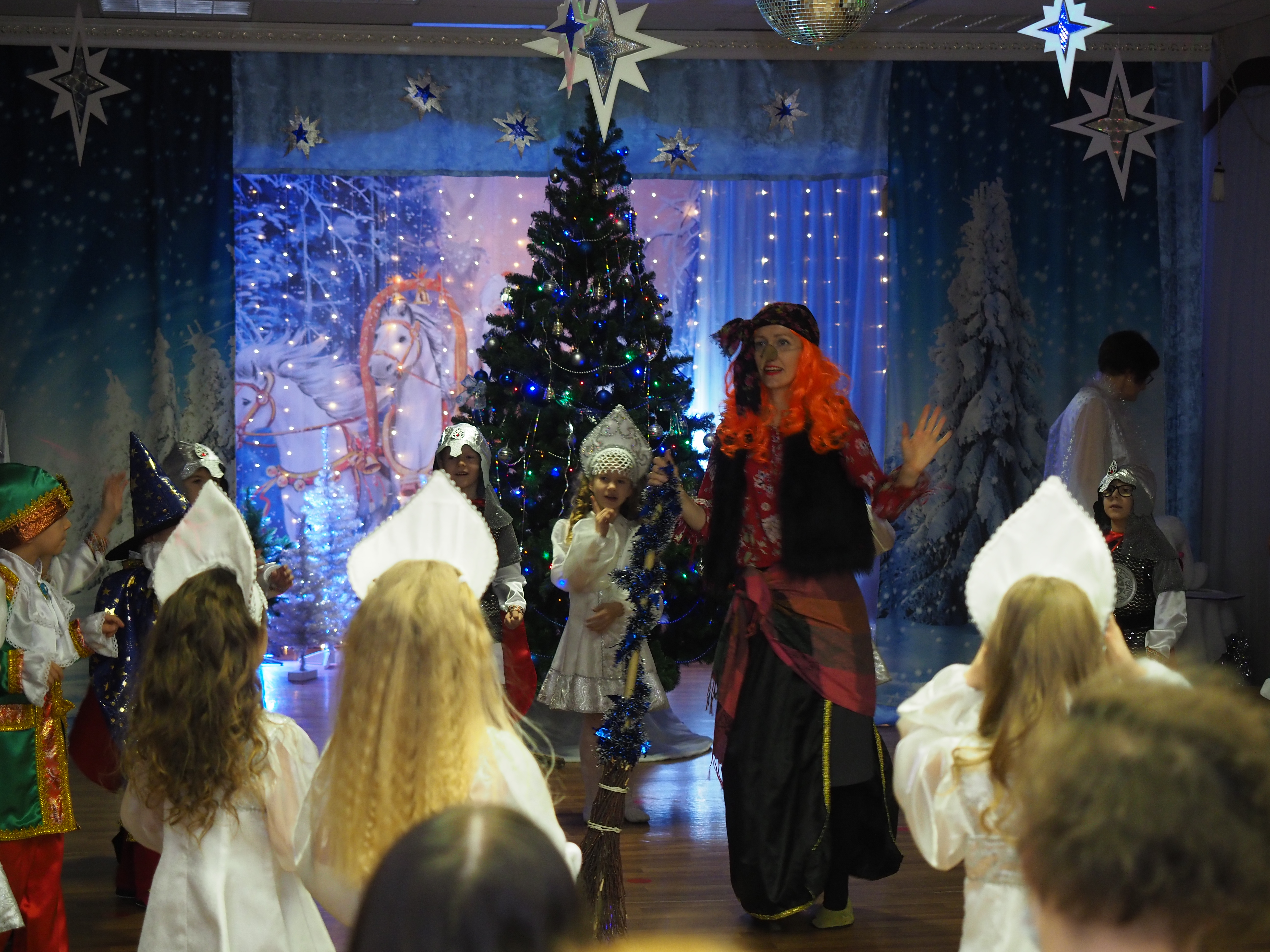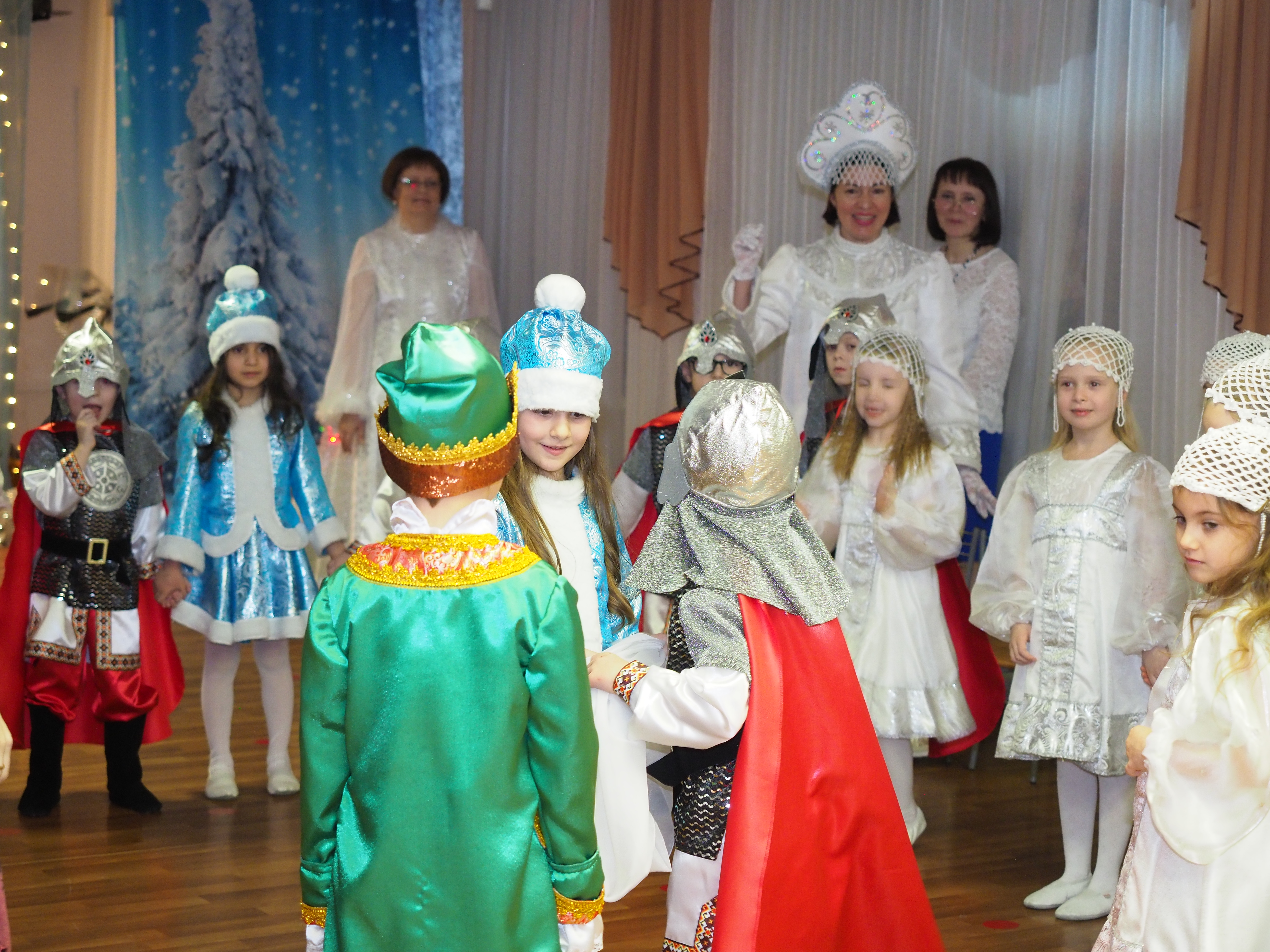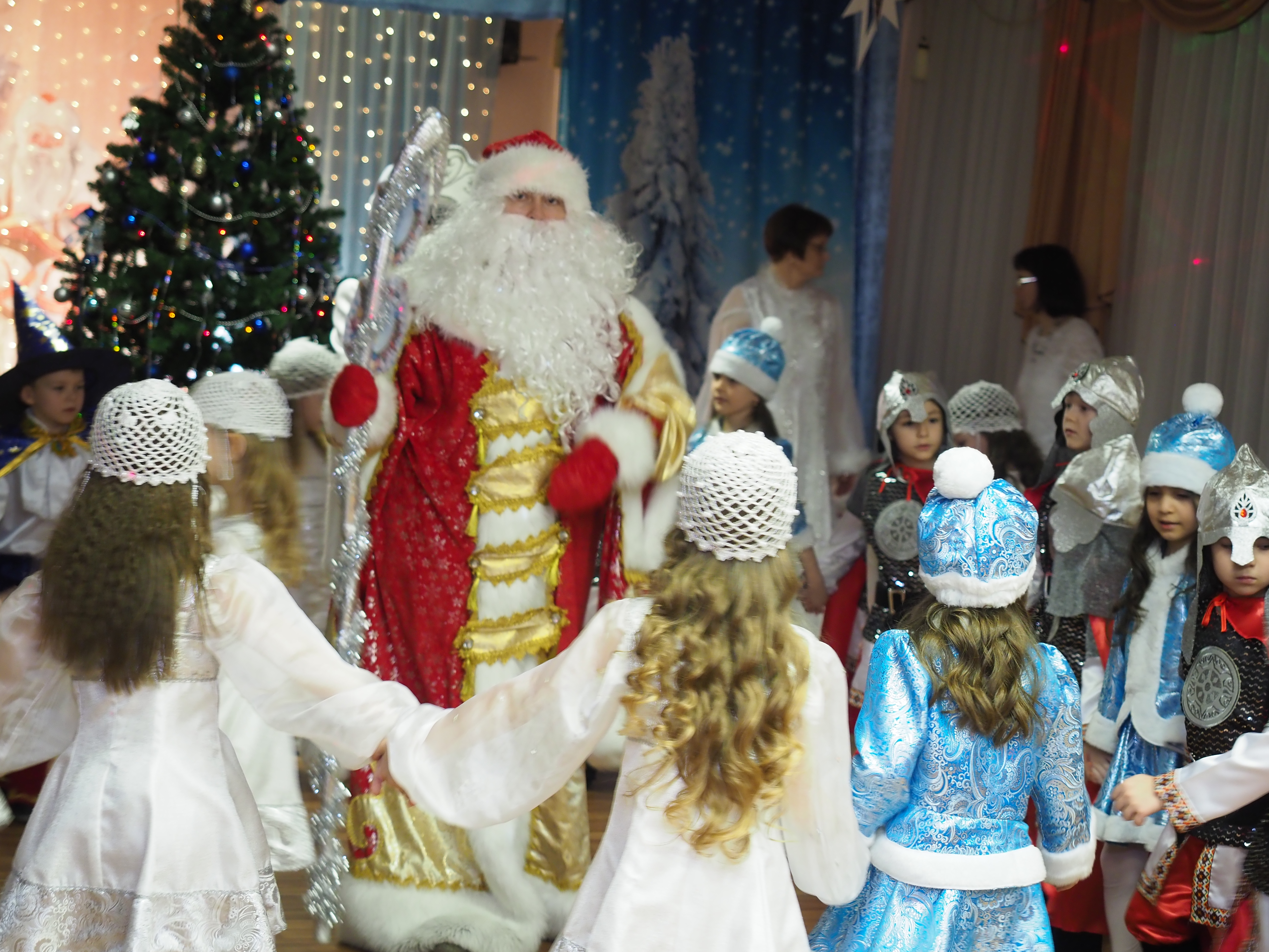 Красиво украшенный зал, нарядная елка, великолепные костюмы, подарки, Дед Мороз, Снегурочка и множество других сказочных персонажей ожидали наших воспитанников. С начала представления сказочные герои увлекали детей в волшебный мир сказки. Дети оказались в праздничной атмосфере приключений, поучаствовали в интересных конкурсах. Ну а с появлением Деда Мороза начался настоящий праздник с песнями и танцами, хороводами вокруг ёлки.
