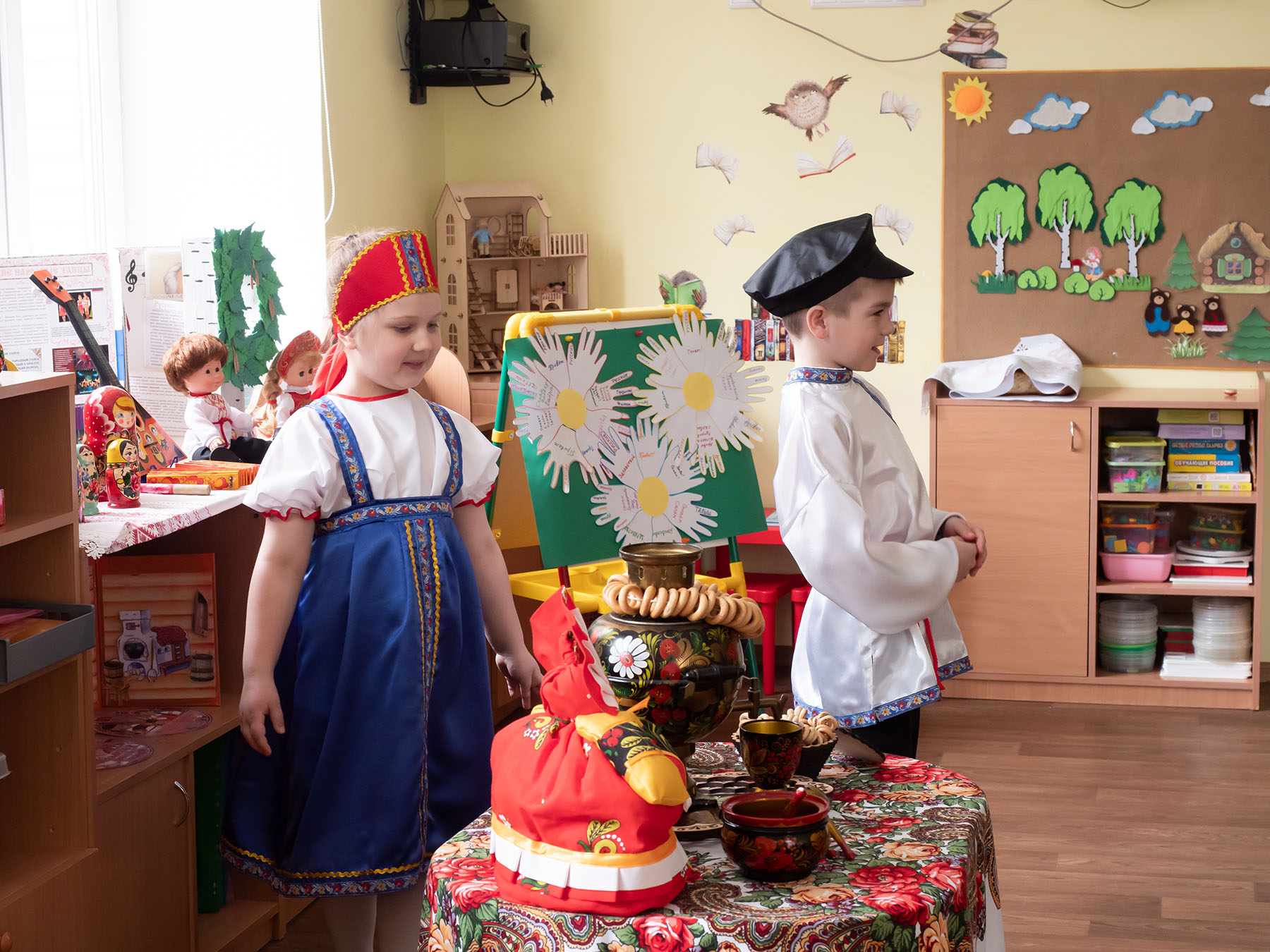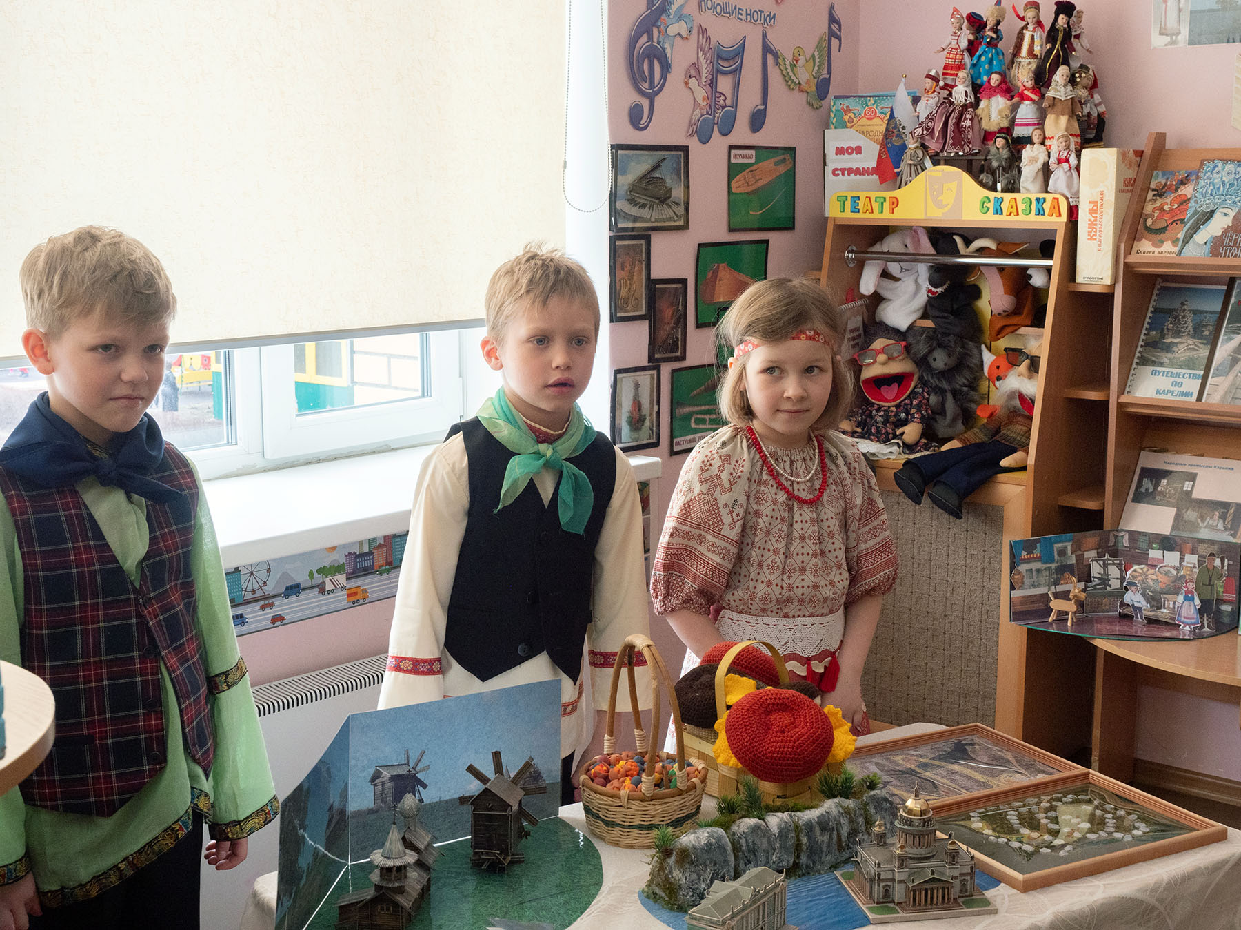 Сегодня в нашем саду прошёл практико-ориентированный семинар городского типа с региональным участием на тему: «ОТ ИСТОКОВ НАРОДНОЙ КУЛЬТУРЫ В СОВРЕМЕННЫЙ МИР ЧЕРЕЗ НРАВСТВЕННО-ПАТРИОТИЧЕСКОЕ ВОСПИТАНИЕ ДОШКОЛЬНИКОВ". Воспитанники группы "Умники и умницы" со своими педагогами-Коваль Надеждой Александровной и Урусовой Татьяной Михайловной встретили гостей по русской традиции хлебом с солью и провели экскурсию в мини-музее "Уголок России", экспонаты которого собраны в рамках проекта "Азбука в России". Воспитанники группы "Веснушки" со своими воспитателями Пауль Екатериной Валерьевной и Синьковской Анной Владимировной познакомили гостей с главными достопримечательностями республики Карелия и угостили национальным блюдом, калитками.